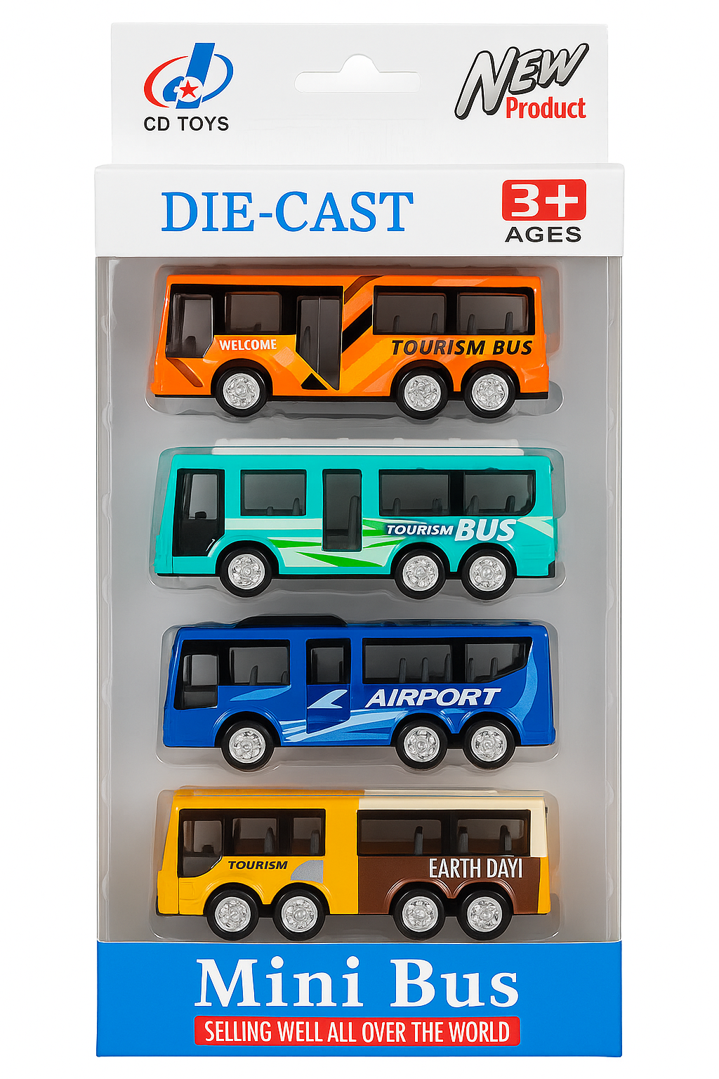 Acest set de 4 minibuze metalice DIE-CAST este perfect pentru micii pasionați de vehicule. Fiecare autobuz are un design diferit – „Tourism Bus”, „Airport Bus”, „Earth Day” – oferind copilului ocazia să creeze povești și rute imaginare fără limite 😄